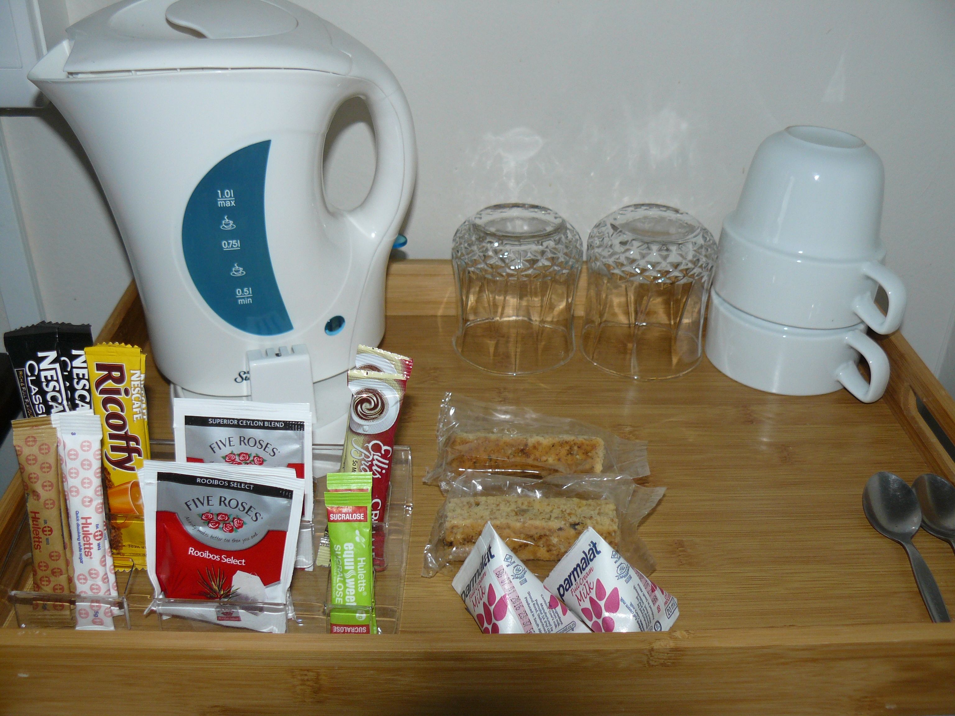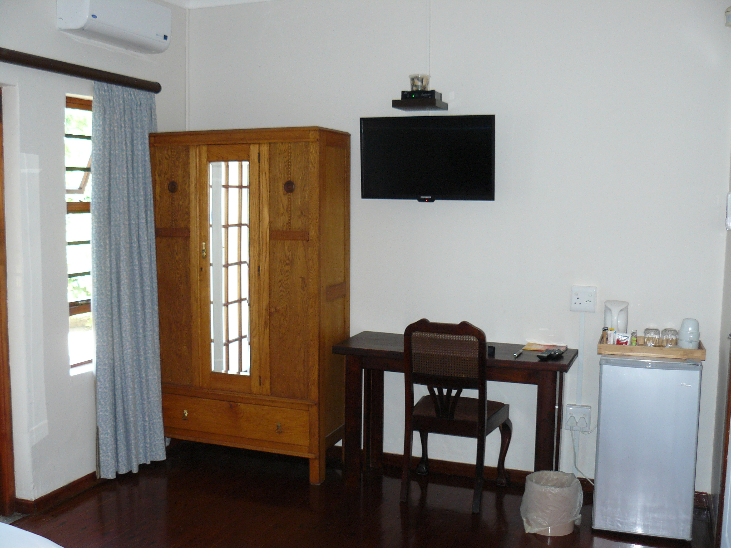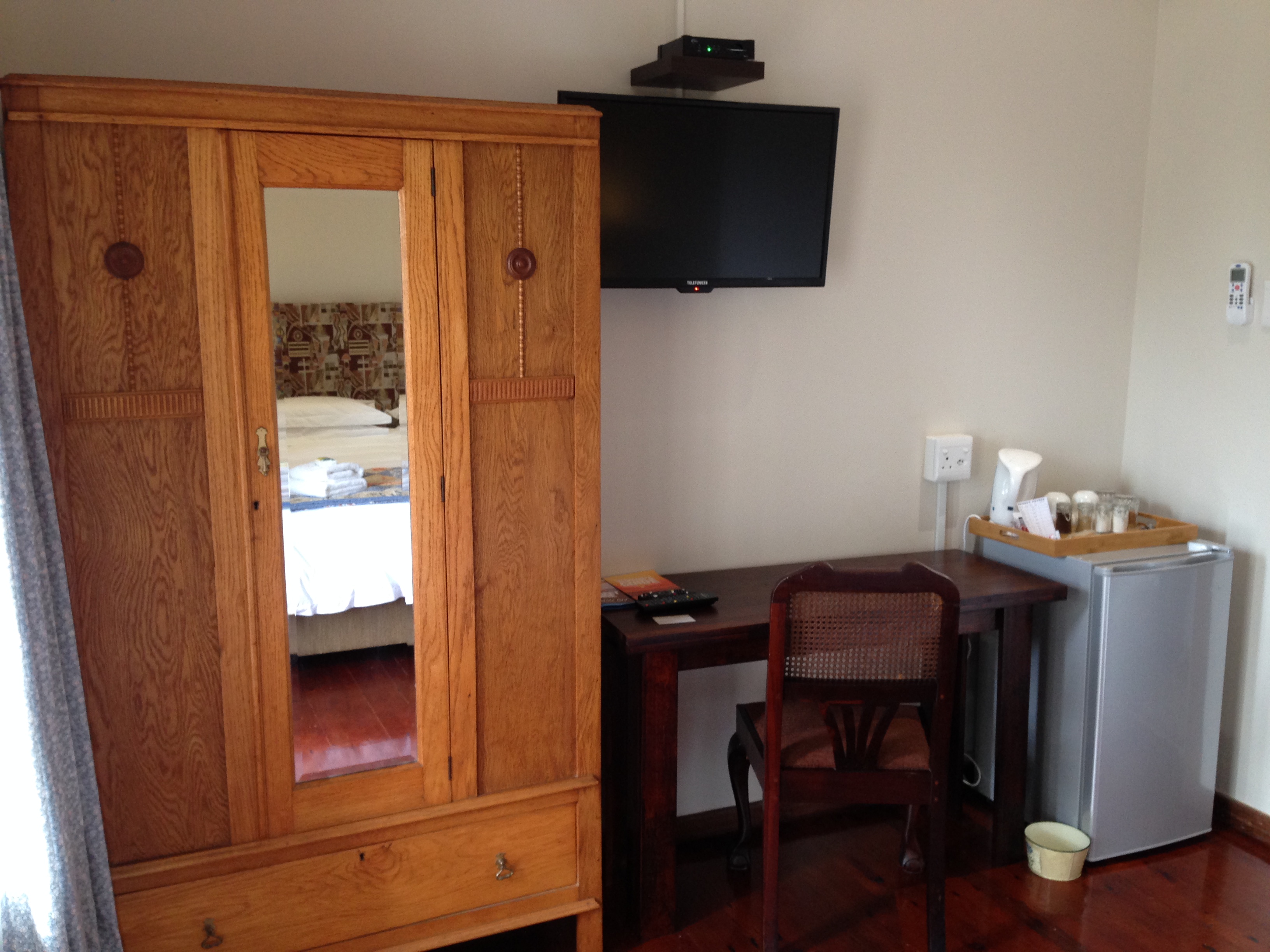 Luxury room with Super King Size Bed (extra length). En-suite bathroom (shower only). Coffee/Tea making facilities. Fridge. Outer door to patio and pool. Netflix. Free Wi-Fi. There is a microwave, crockery and cutlery in the BnB kitchen which can be used by guests.